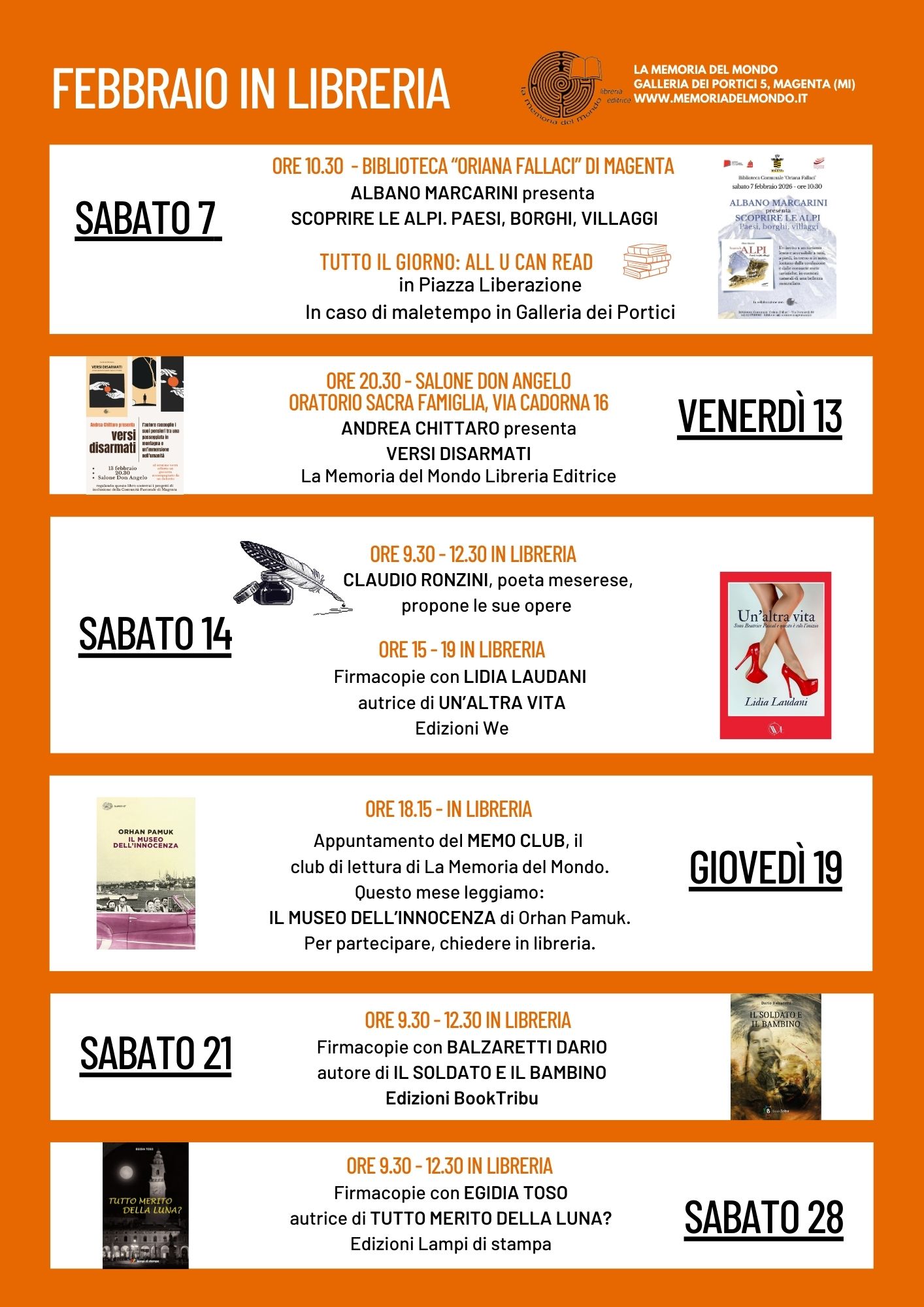 ...ARRIVA FEBBRAIO...! Febbraio si riempie di storie, incontri e appuntamenti firmati! SABATO 7 ALBANO MARCARINI presenta SCOPRIRE LE ALPI. PAESI, BORGHI, VILLAGGI ORE 10.30 - BIBLIOTECA “ORIANA FALLACI” DI MAGENTA ..... TUTTO IL GIORNO: ALL U CAN READ I<...